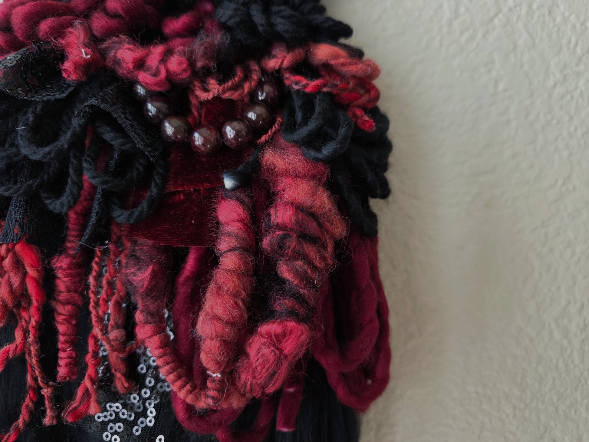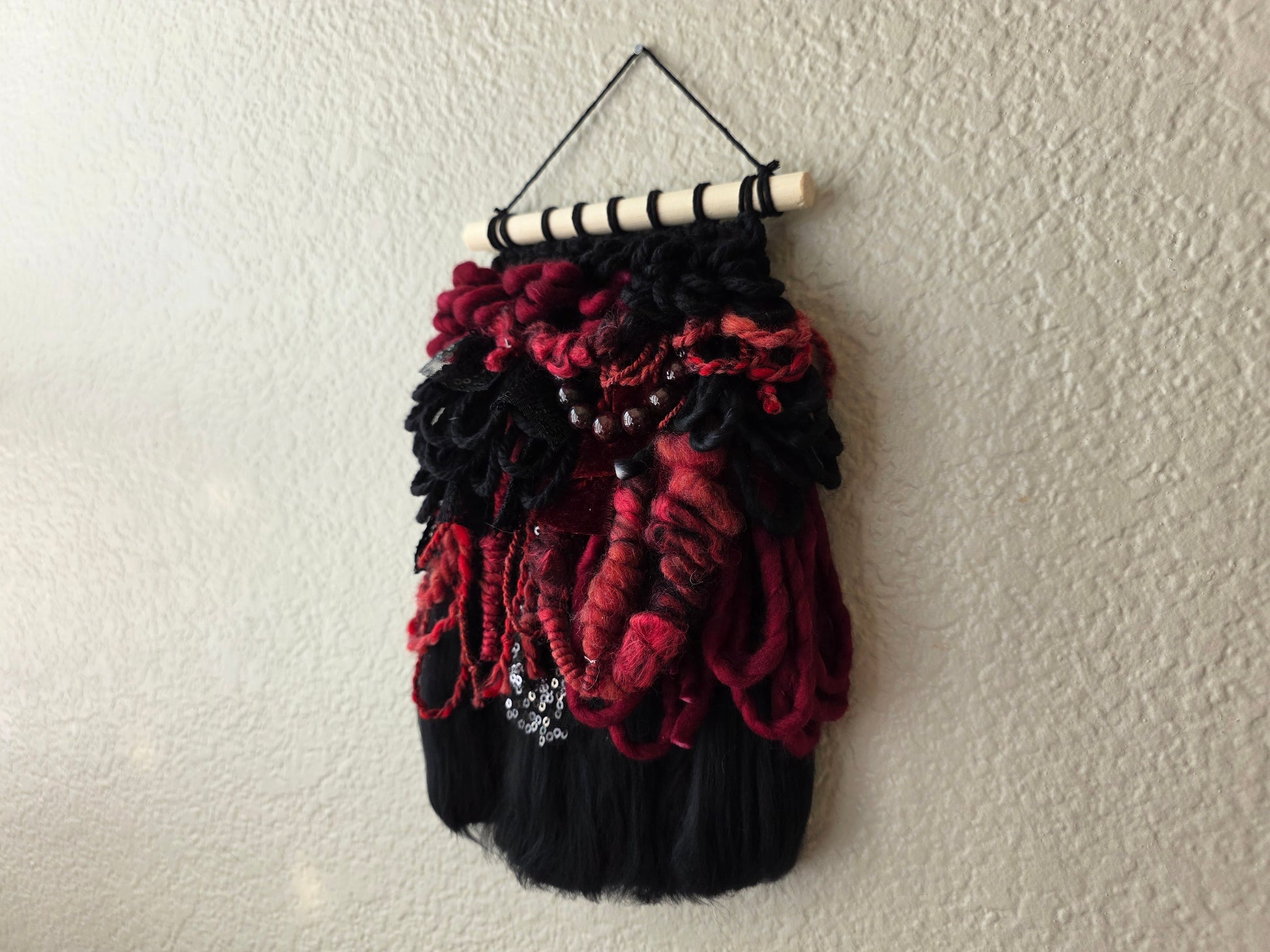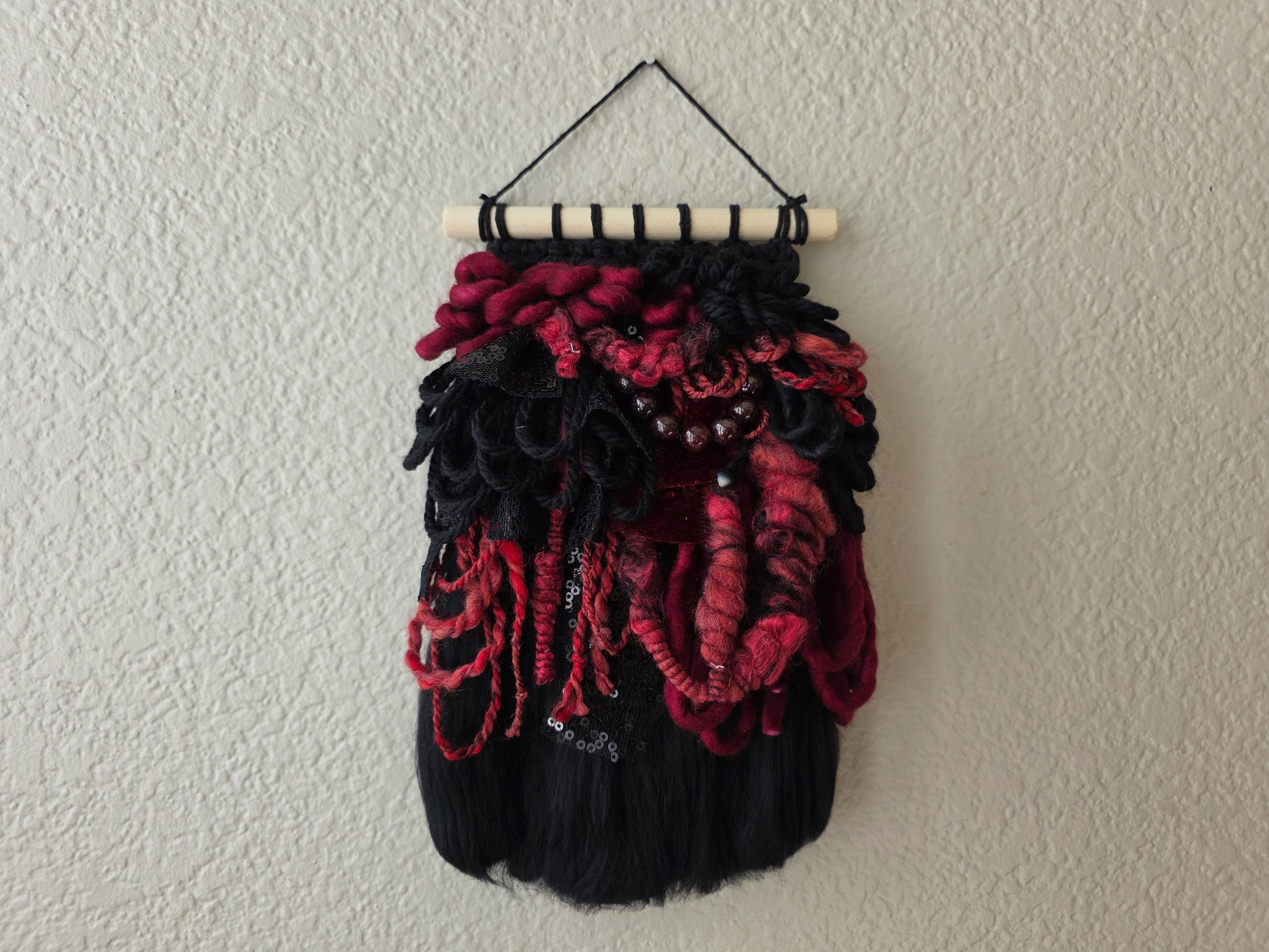 Blair is a mini weaving, featuring a palette that's inspired by the pretty, dark red stone, Garnet. This piece include genuine beads made from genuine garnet. Made using hand dyed and/or spun wool, yarn, and cotton cords, sourced by other small female run businesses.