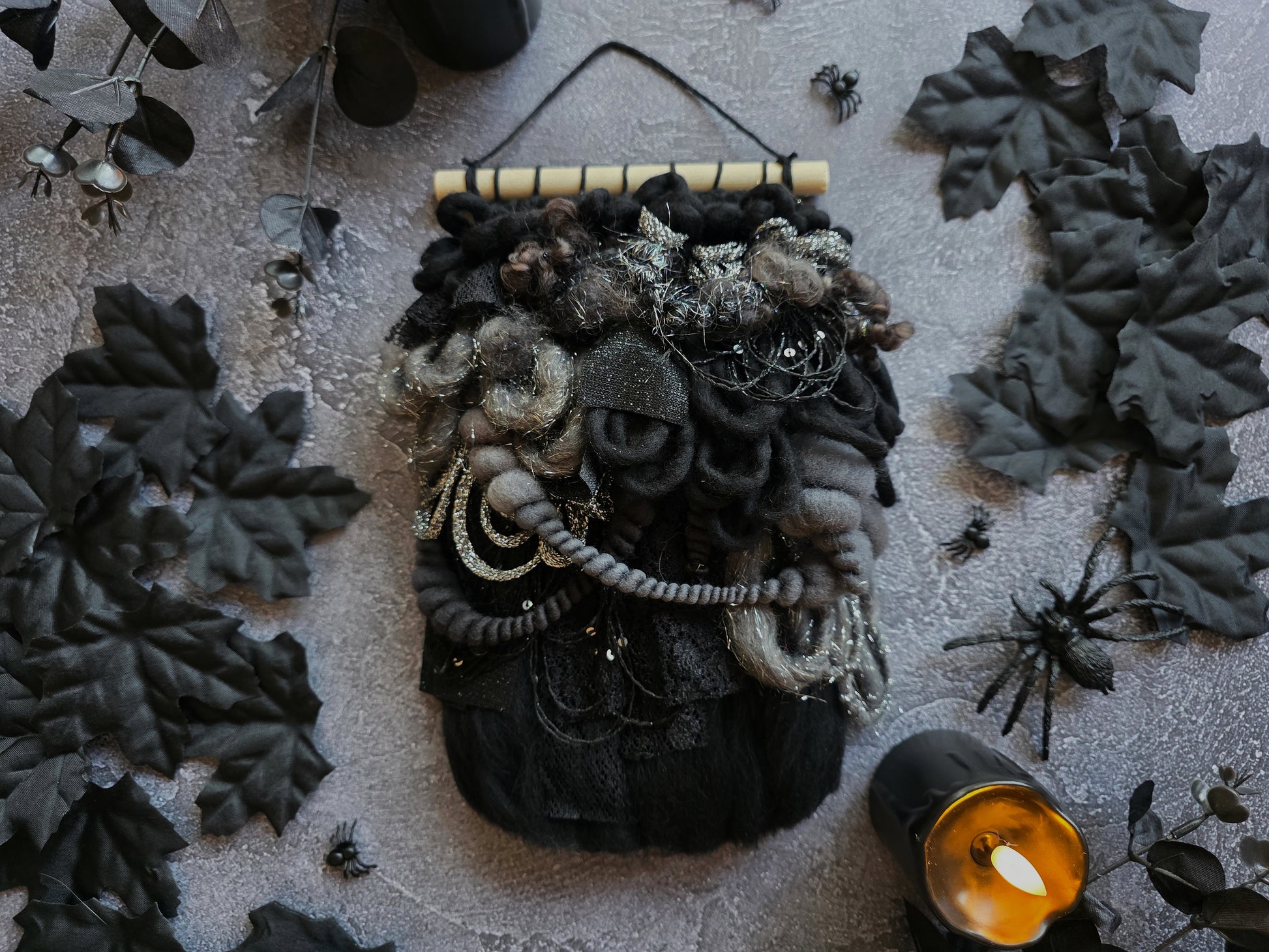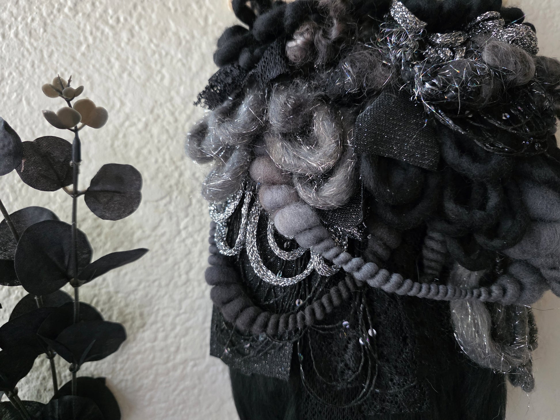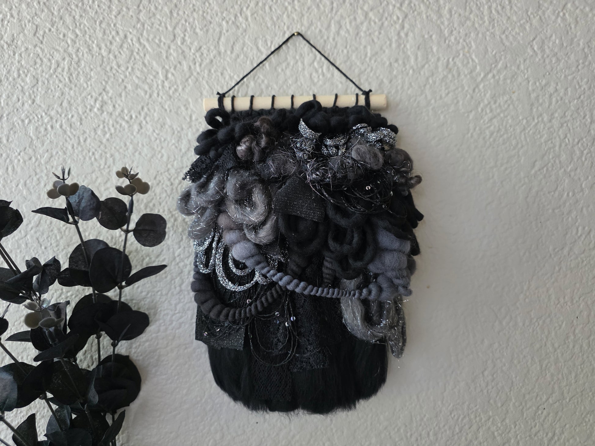 Calista a pretty little mini weaving. A pretty palette of black, gray, and silver, with lots of sparkles and sequins throughout. She's made with a variety of hand dyed and/or spun wool fibers from other small, woman-run businesses.