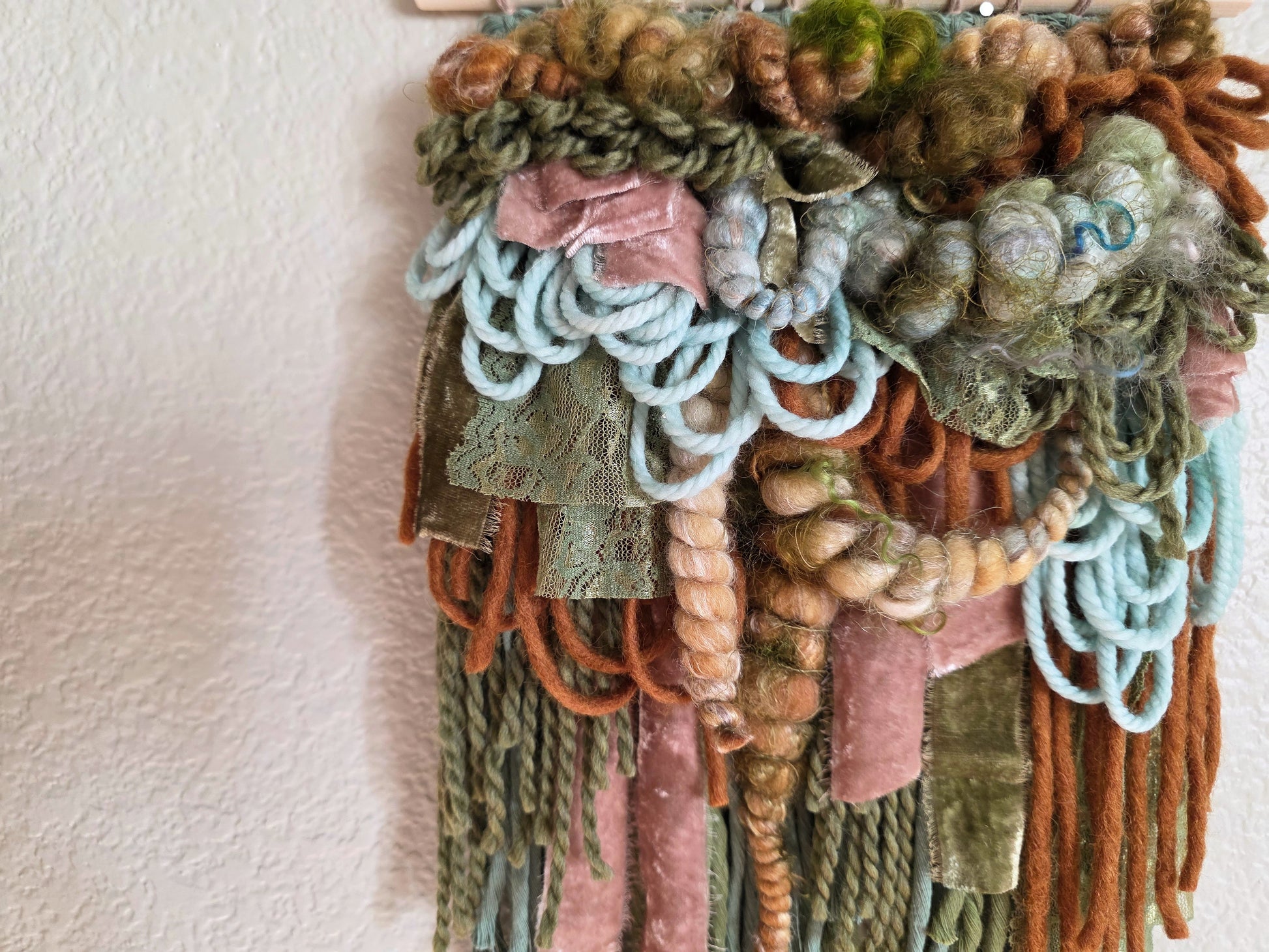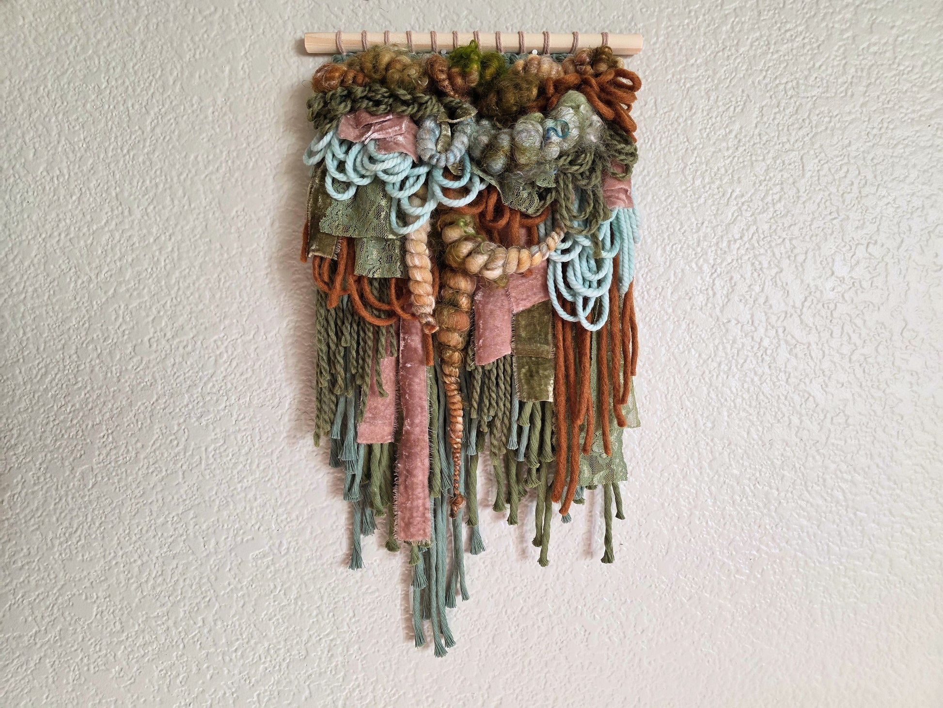 Day Four of my 12 Days of Weaving challenge is this pretty small weaving, made with a gorgeous palette of brown, green and sky blue. The prettiest forest vibes. This piece is made using hand dyed and hand spun wool yarns, silk and velvet ribbons, and cotton cord, sourced from other female owned small businesses.