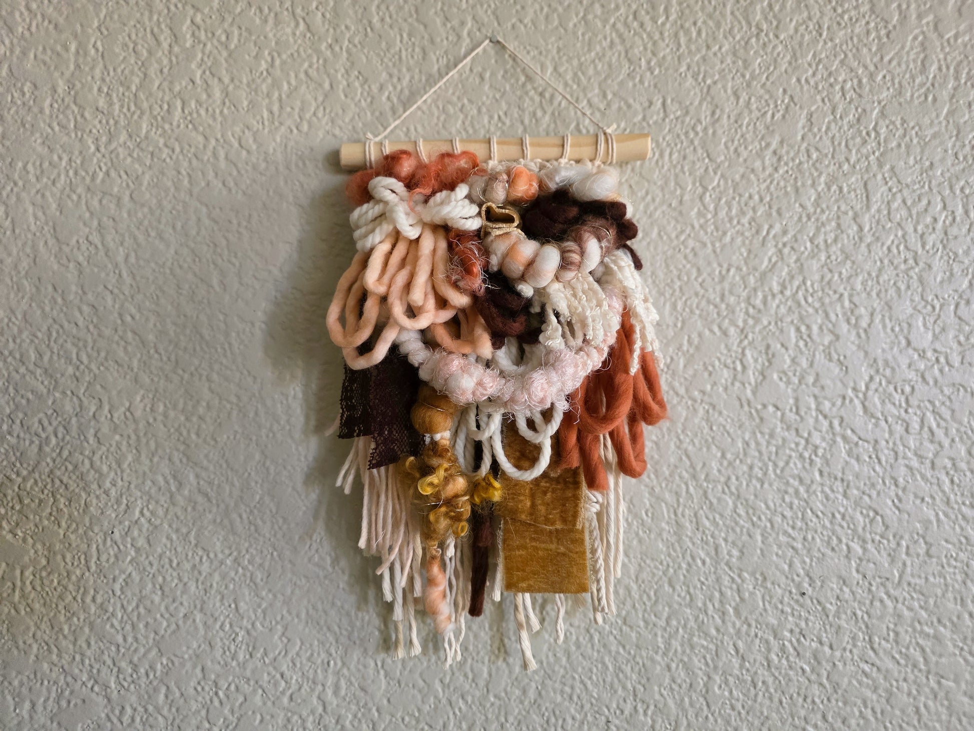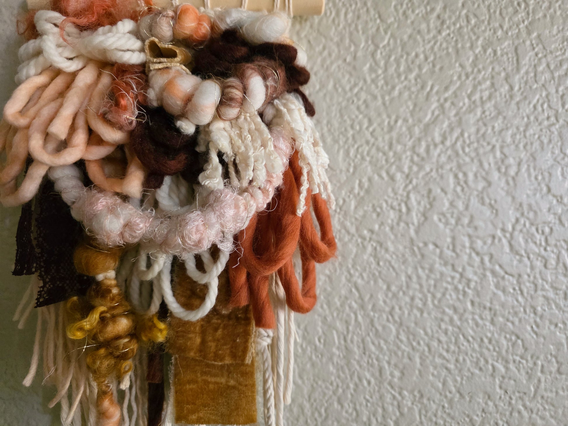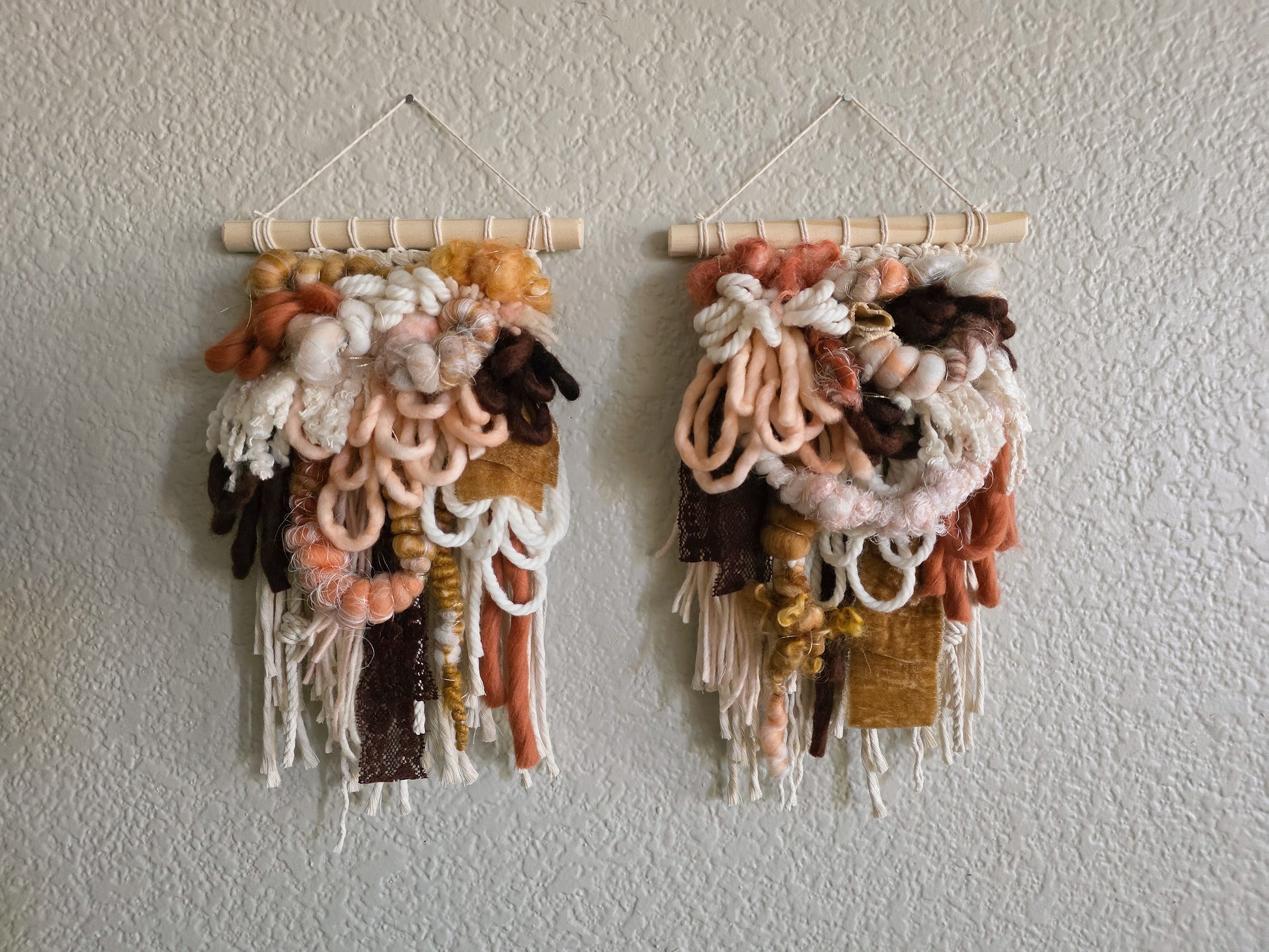 Day Three of my 12 Days of Weaving challenge is this pair of mini weavings, made with a gorgeous palette of brown, mustard, orange, peach and natural. This piece is made using hand dyed and hand spun wool yarns, silk and velvet ribbons, and cotton cord, sourced from other female owned small businesses.