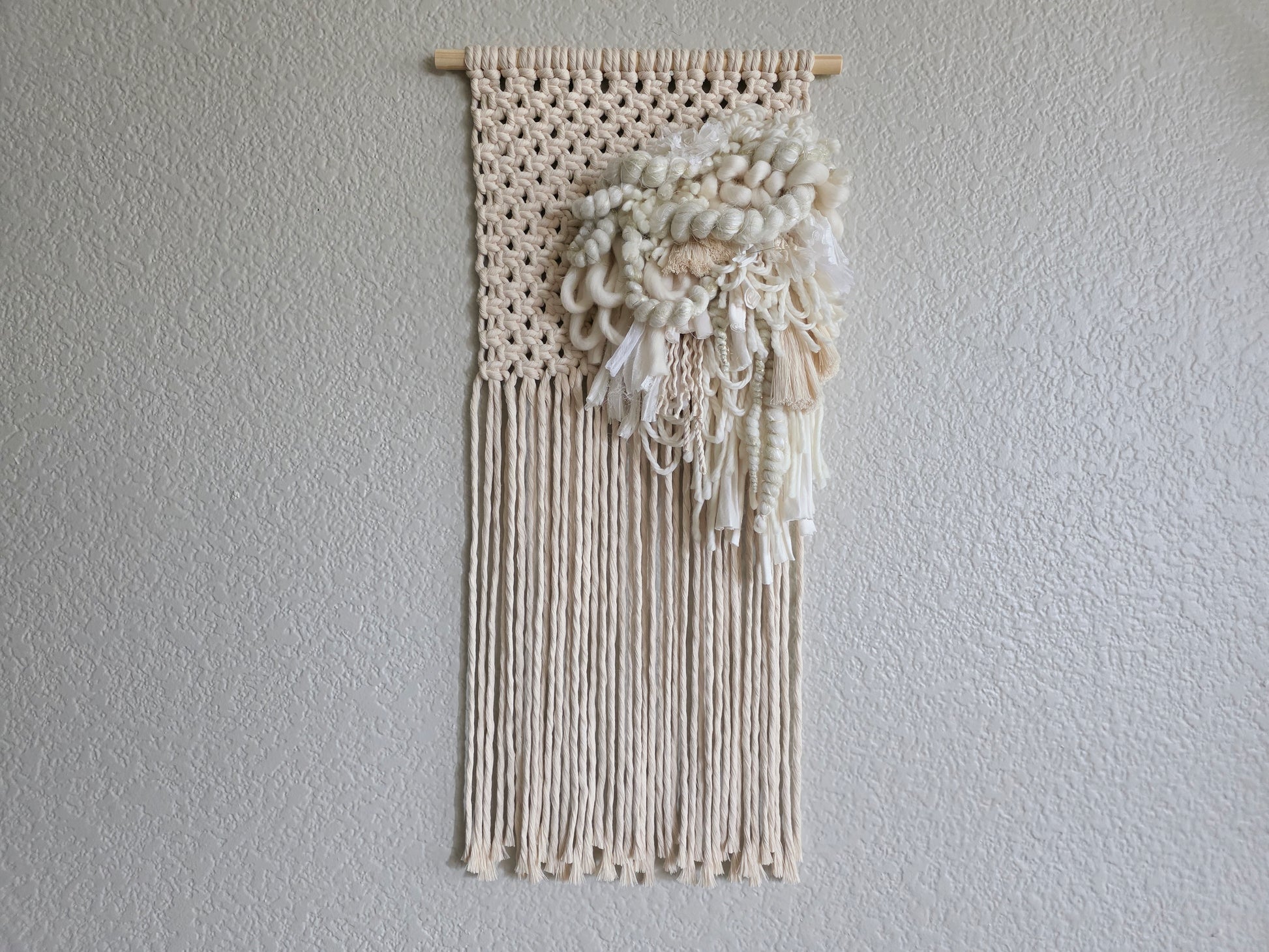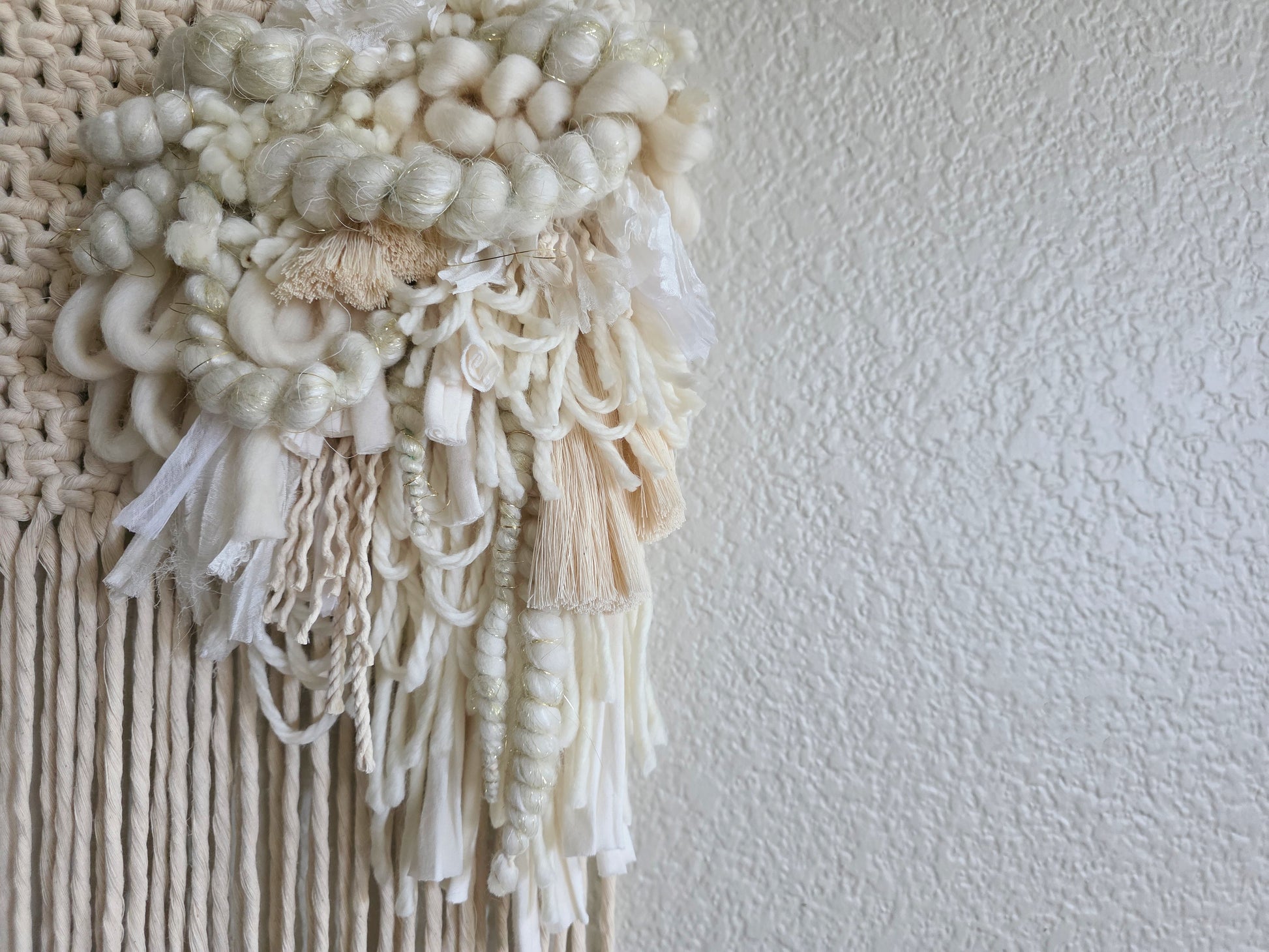 Day Twelve of my 12 Days of Weaving challenge is this pretty macraweave, made with a gorgeous monochromatic neutral palette. This piece is made using hand dyed and hand spun wool yarns, silk and velvet ribbons, and cotton cord, sourced from other female owned small businesses.
