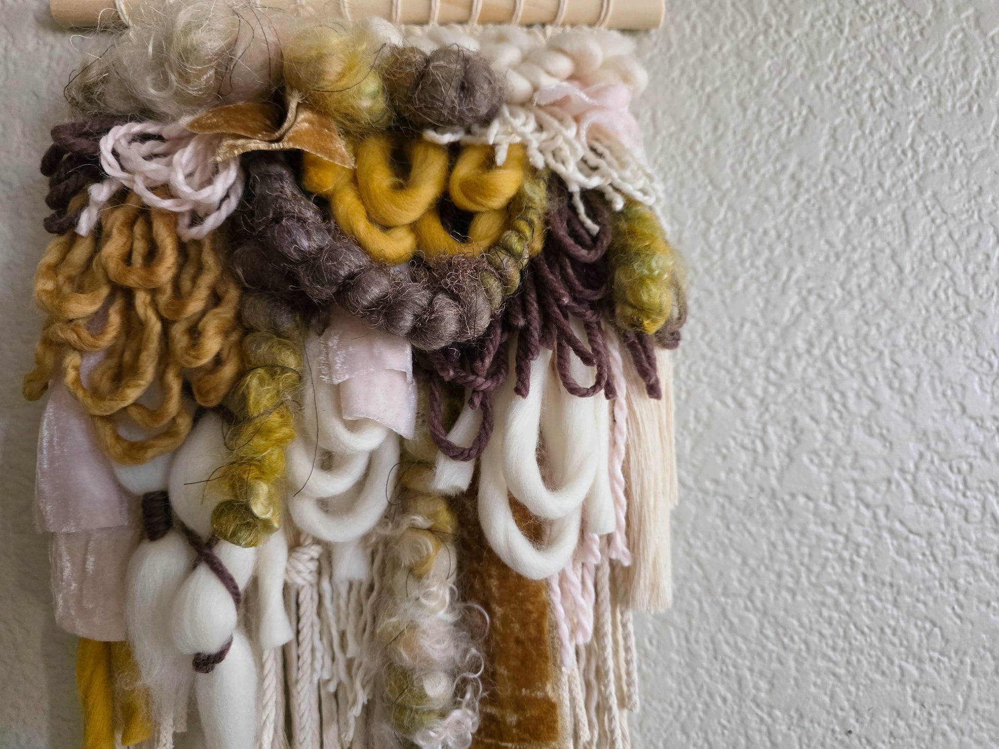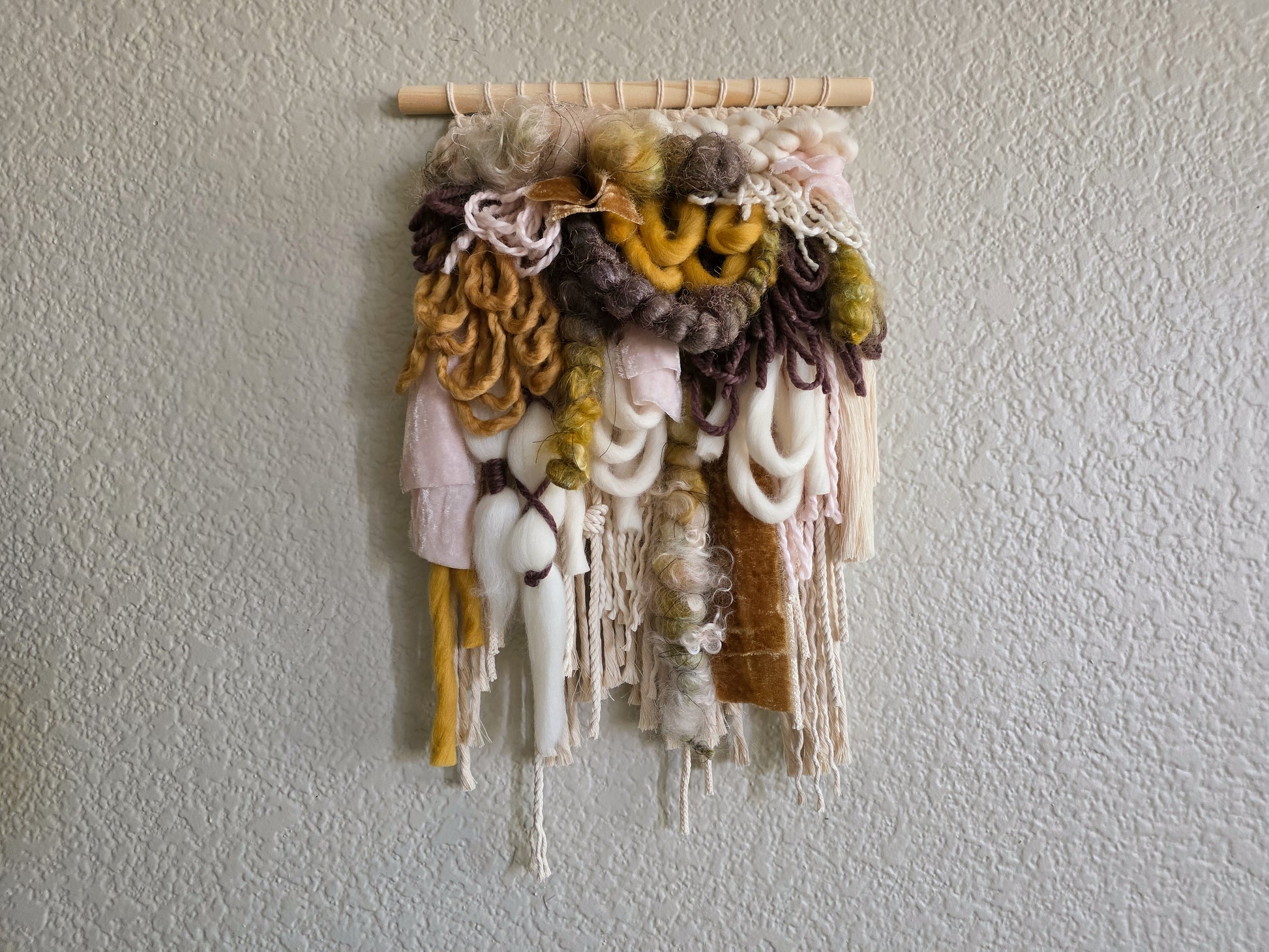 Day Two of my 12 Days of Weaving challenge is this pretty small weaving, made with a gorgeous palette of brown, mustard, blush pink and natural. This piece is made using hand dyed and hand spun wool yarns, silk and velvet ribbons, and cotton cord, sourced from other female owned small businesses.