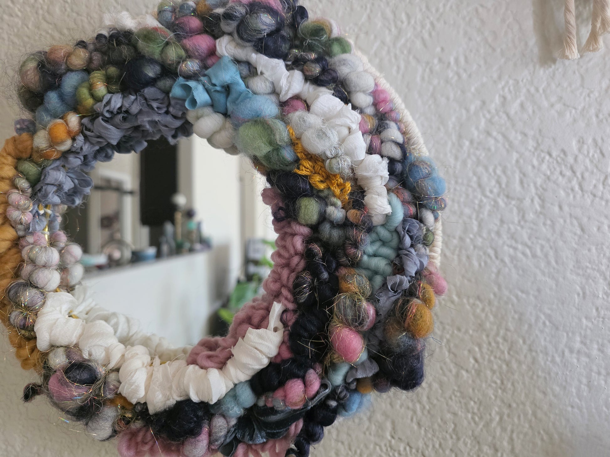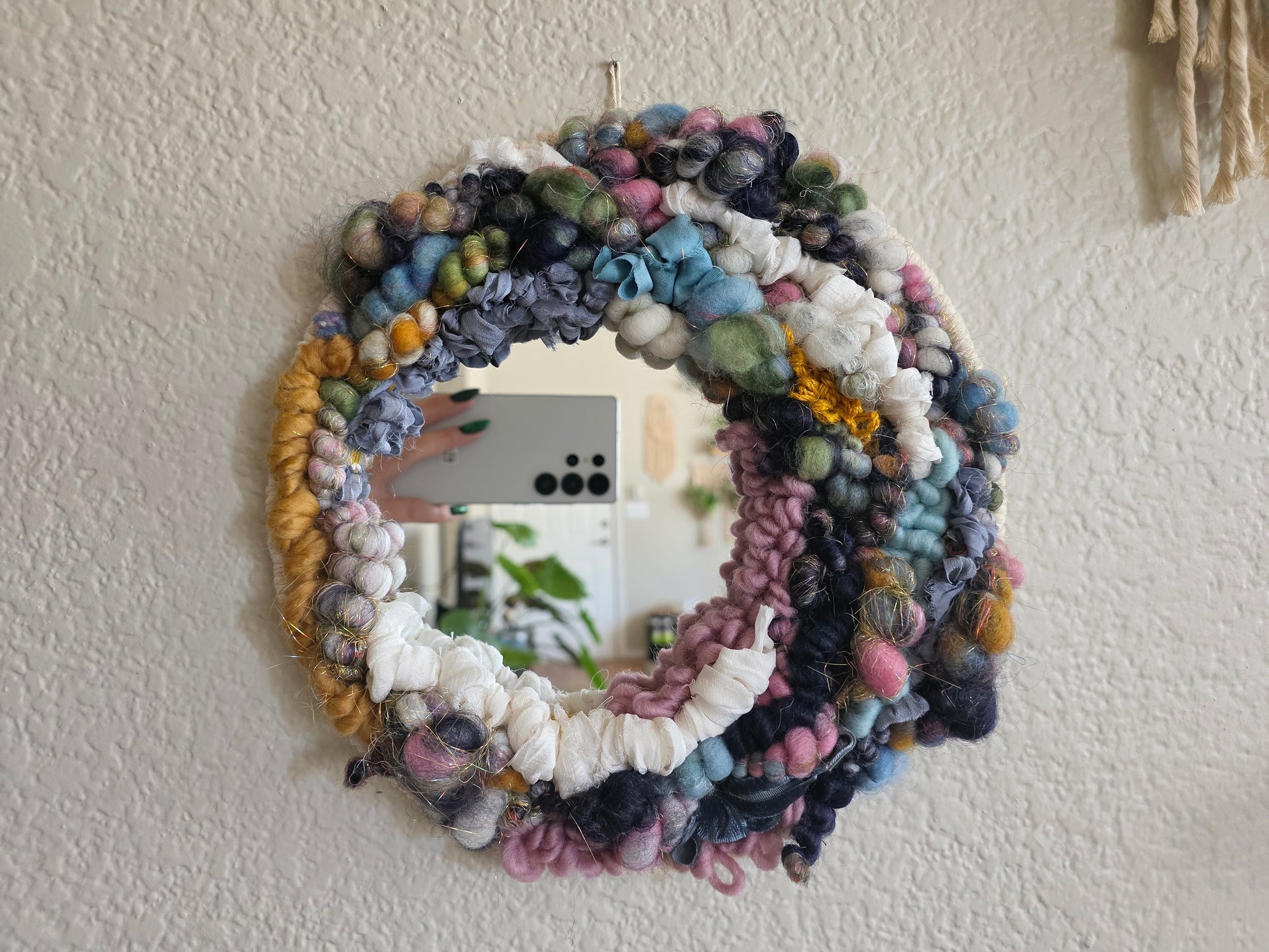 Layla is a pretty, small woven mirror, made with a palette of navy, natural, mustard, pink and blue. She's made using hand dyed, hand spun art yarn, wool yarns, lace ribbons, and recycled cotton cord, all sourced for other small businesses.