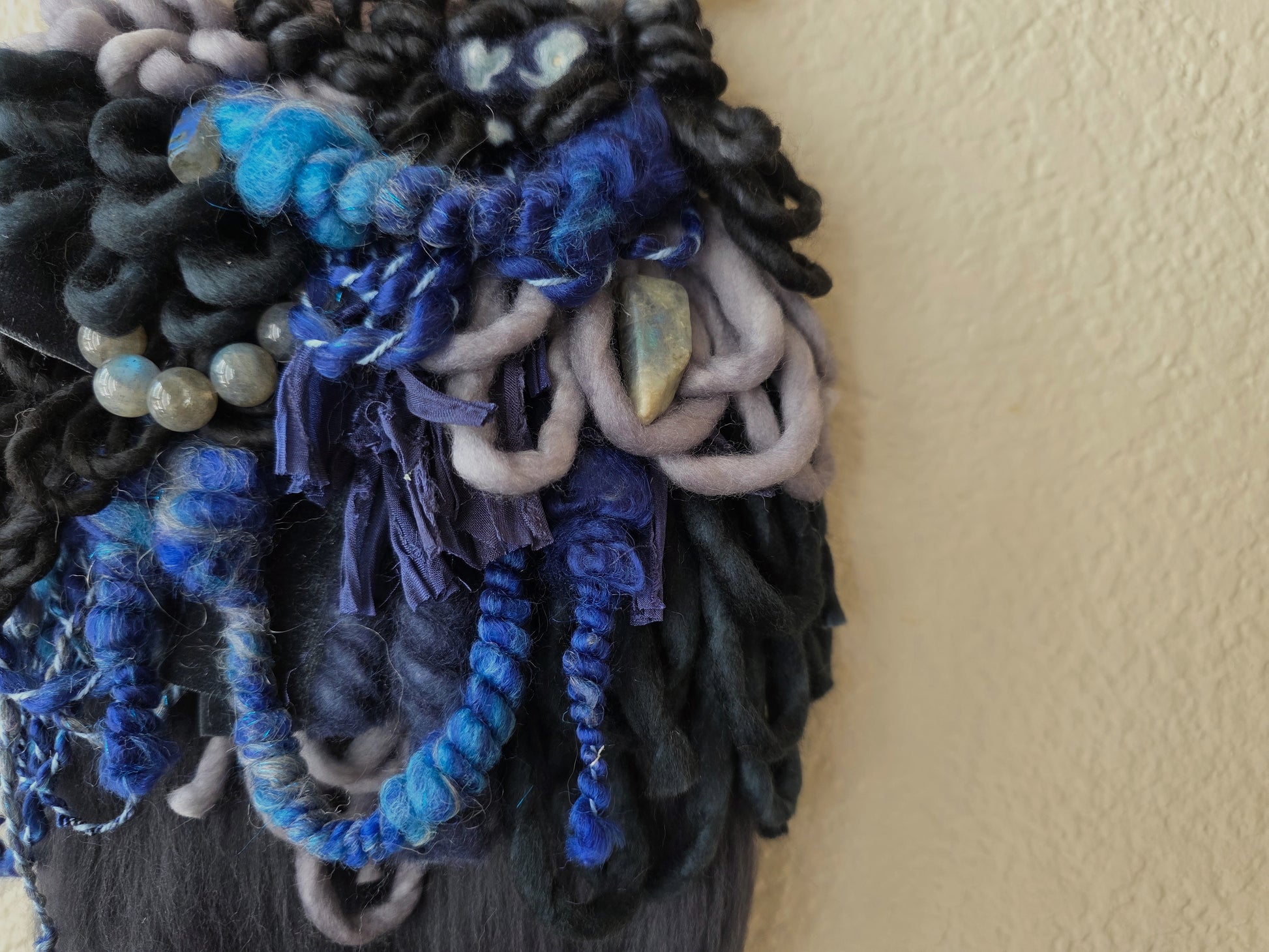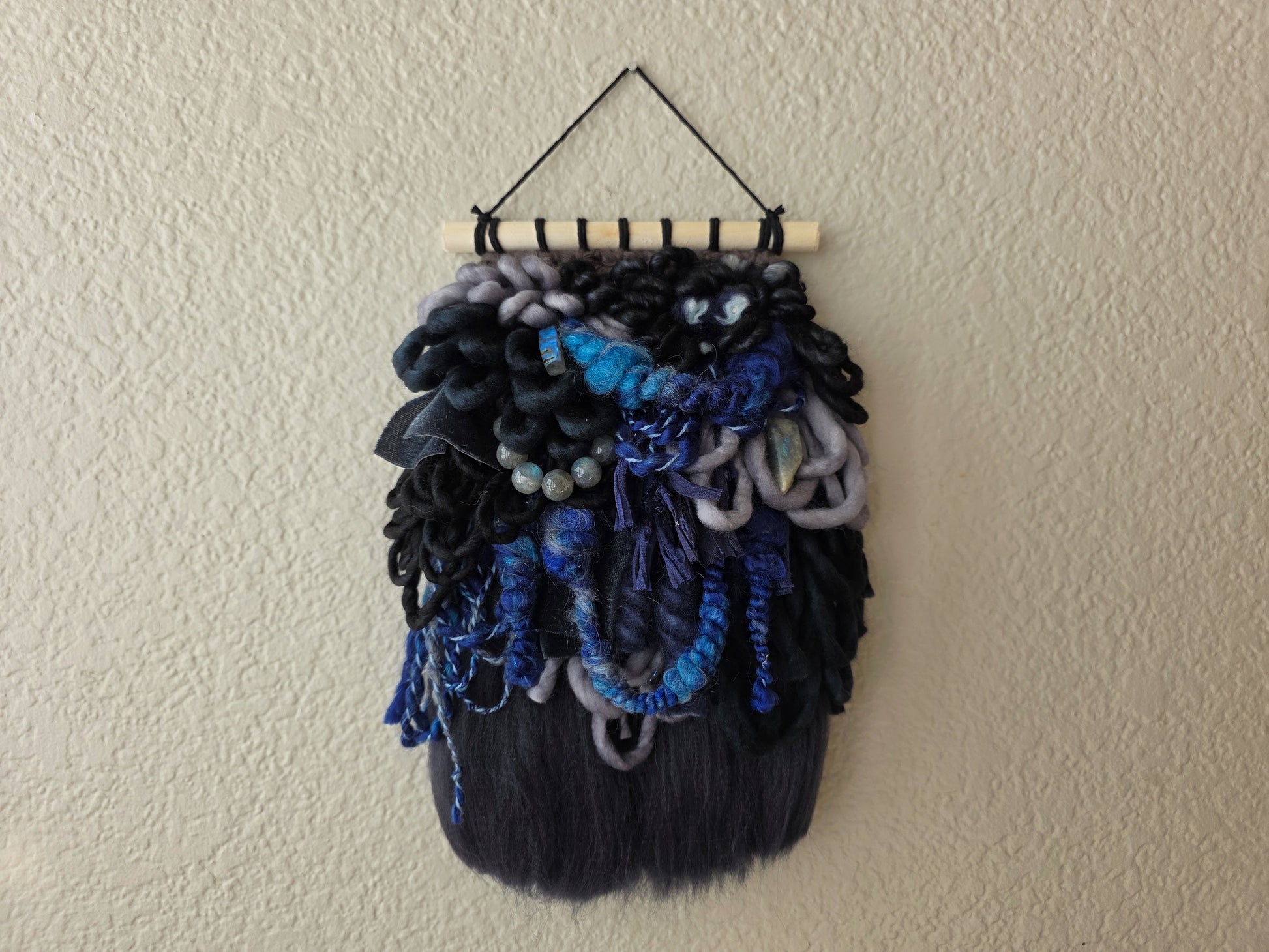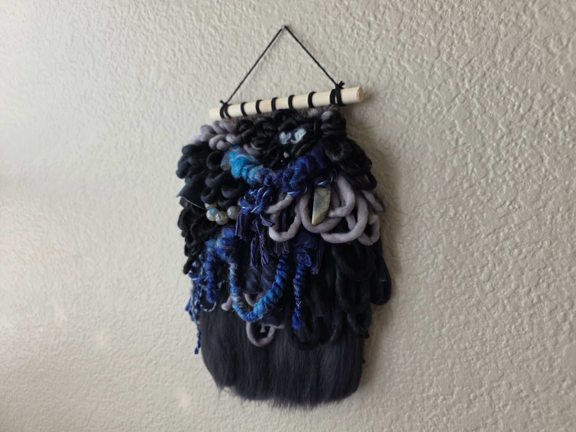 Minerva is a mini weaving, featuring a palette that's inspired by the pretty, gray with blue stone, Labradorite. This piece include genuine beads made from super flashy blue labradorite. Made using hand dyed and/or spun wool, yarn, and cotton cords, sourced by other small female run businesses.