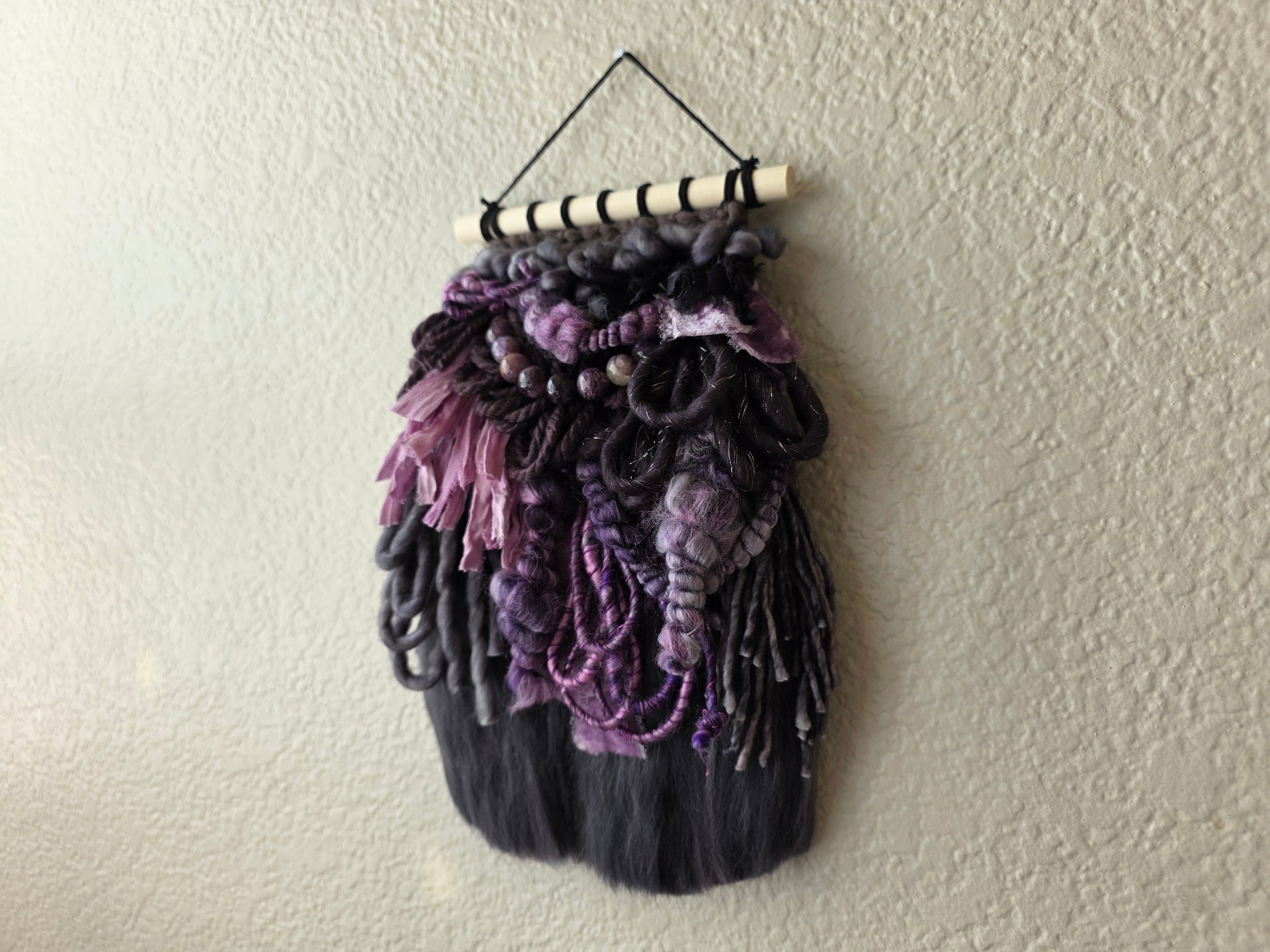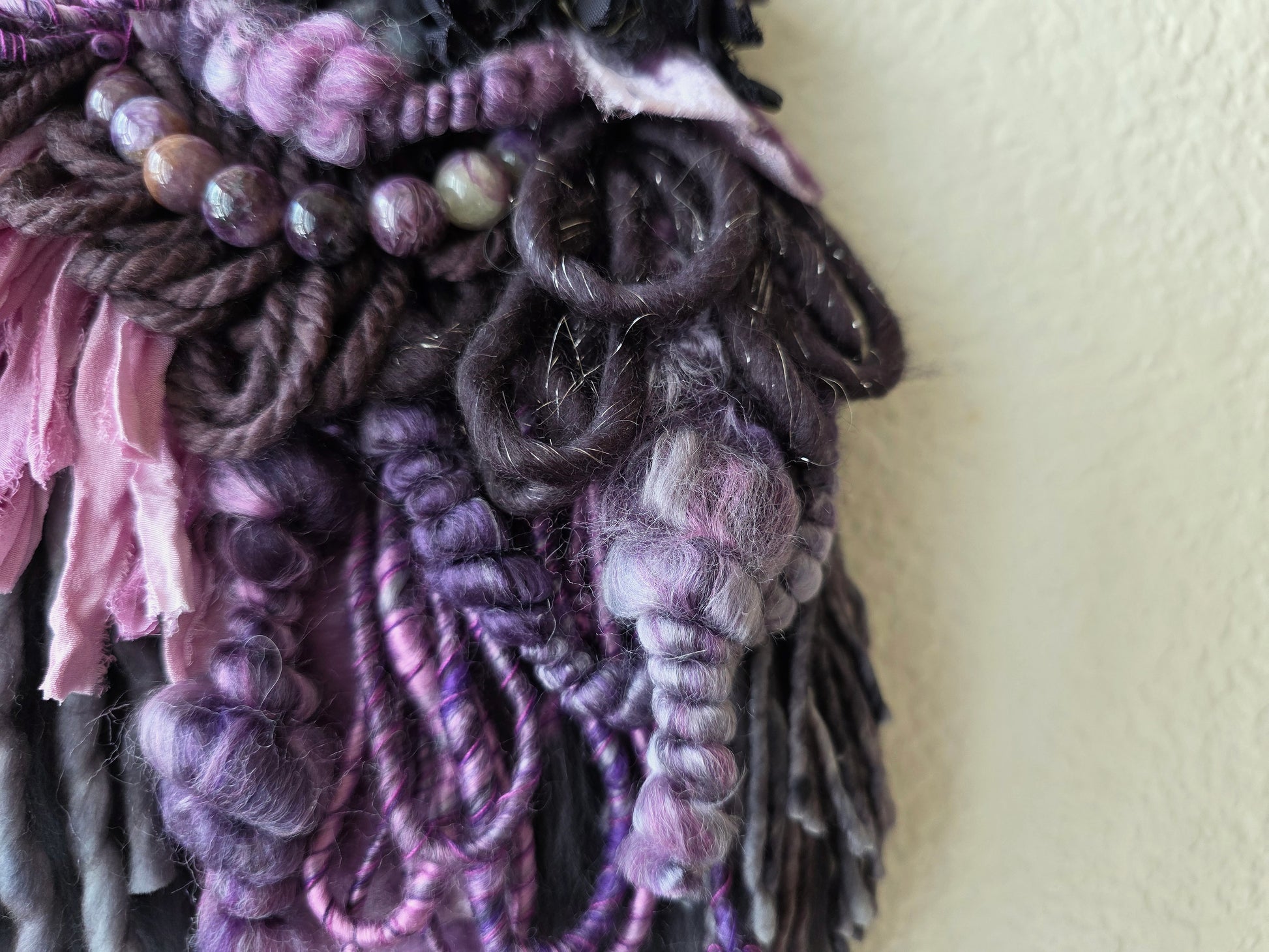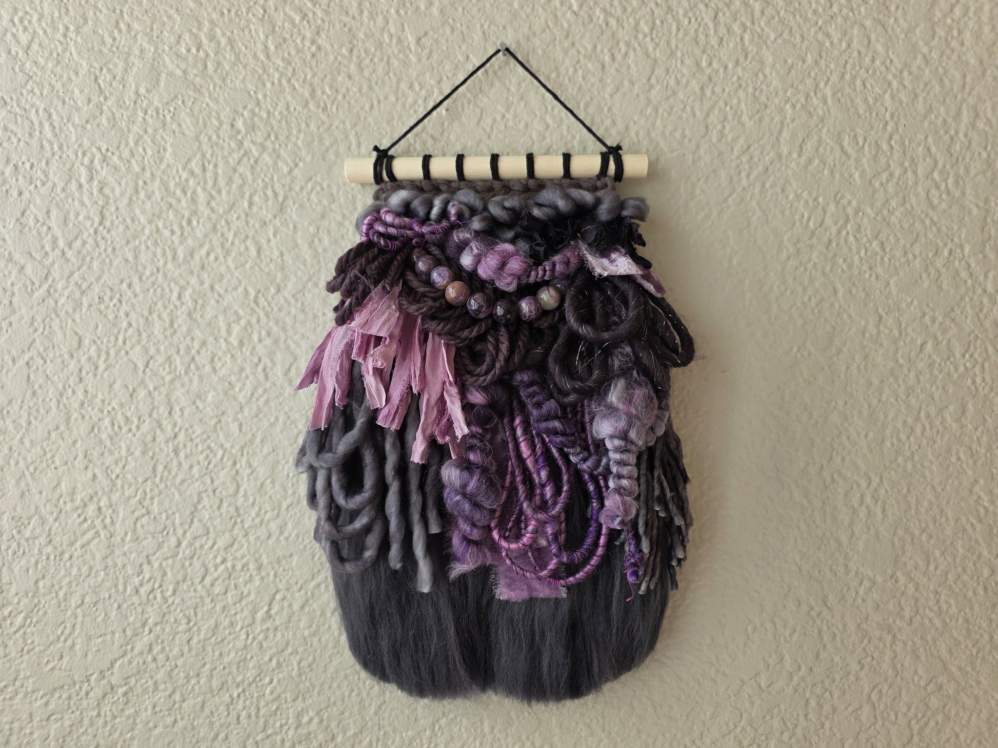 Nyx is a mini weaving, featuring a palette that's inspired by the pretty, swirly purple stone, Charoite. This piece include genuine beads made from charoite. Made using hand dyed and/or spun wool, yarn, and cotton cords, sourced by other small female run businesses.
