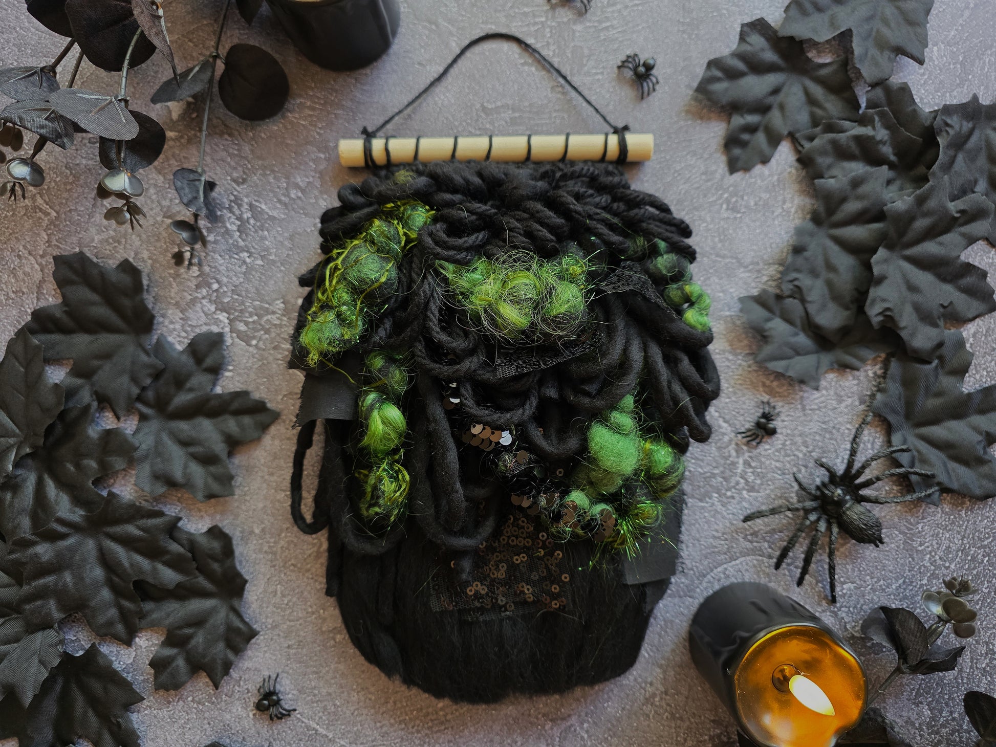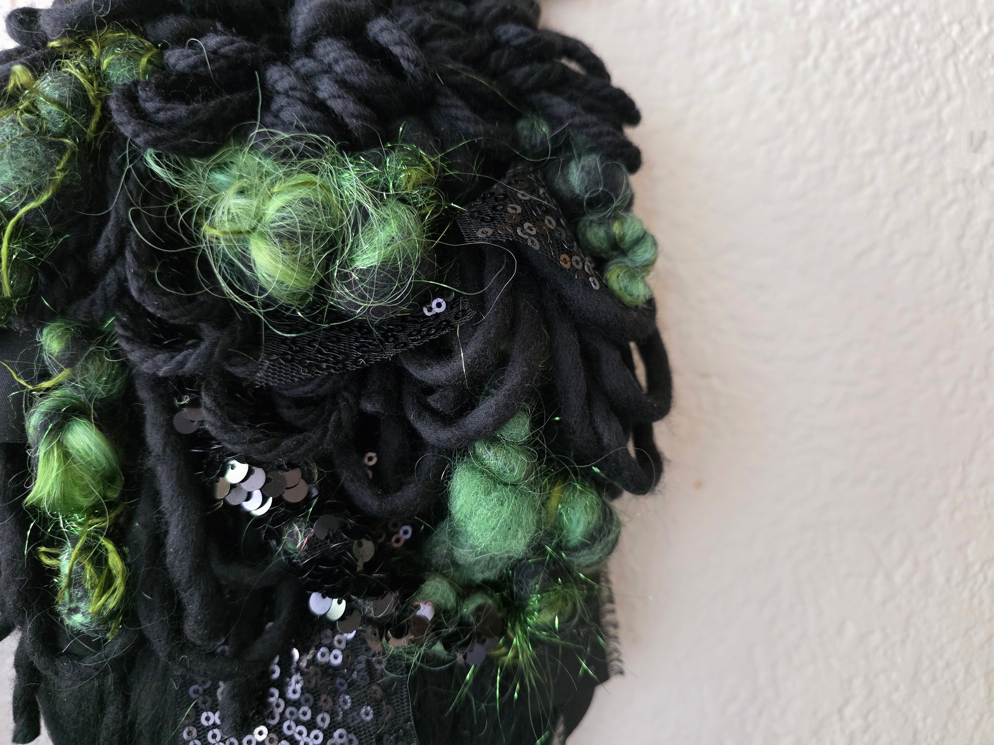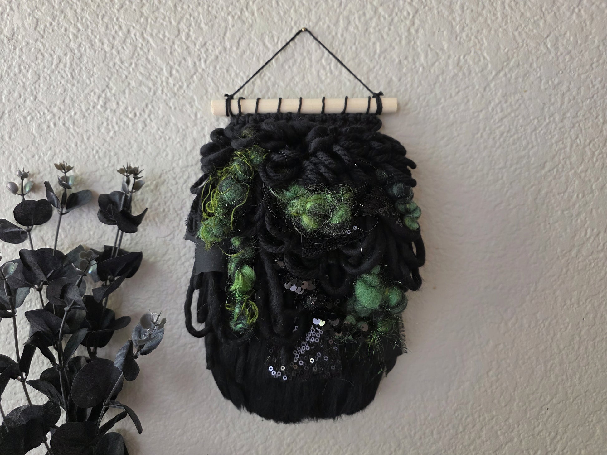 Seraphina a pretty little mini weaving. A pretty palette of black and green, with lots of sparkly black sequins throughout. She's made with a variety of hand dyed and/or spun wool fibers from other small, woman-run businesses.
